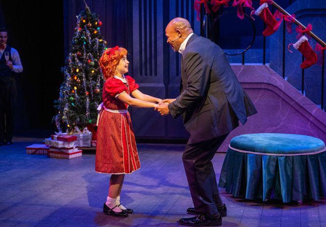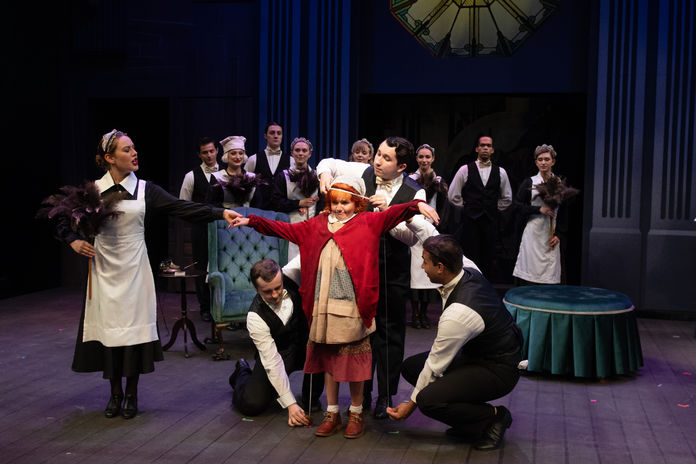 Color was used to separate the social classes represented in Annie. The poor characters, including the orphans, and the Hooverville residents, were dressed in faded shades tinted with tan and gray. The villains, who spend much of the plot craving wealth, dressed in oversaturated, clashing colors, in an effort to separate themselves from the poor masses. The wealthy characters dressed in dark neutrals, with Daddy Warbucks' world existing in black and white. When Annie arrived to the Warbucks residence, she brought color with her, making her stand out against the otherwise restrained color palette.